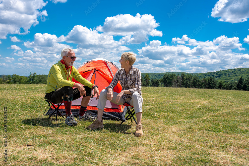 Senior couple camping in the nature, sitting in front of the tent with beautiful landscape in the background