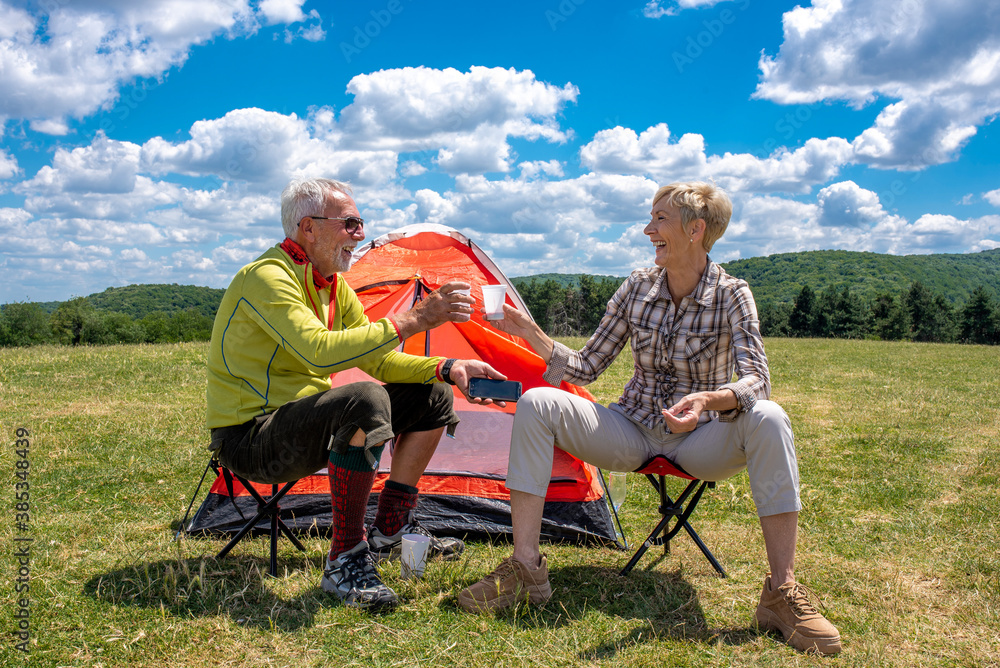Senior couple camping in the nature with beautiful landscape in the background