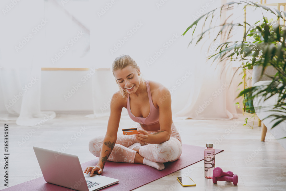 Smiling funny beautiful young strong sporty fitness woman wearing pink tracksuit doing yoga exercises using laptop computer hold credit bank card sitting and stretching on mat floor at home indoor.