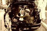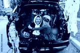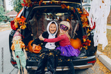 Trick or trunk. Children celebrating Halloween in trunk of car. Boy and girl with red pumpkins celebrating traditional October holiday outdoors. Social distance and safe alternative celebration.
