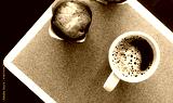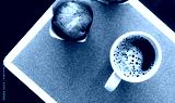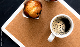 Tiempo de relajarse tomarse un momento y disfrutar de un delicioso Muffin de arándanos junto a una rica taza de café caliente. Vista en cenital de taza de cerámica junto a Muffin casero.
