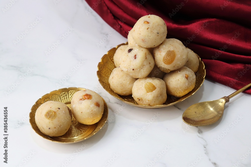 Rawa Ladu, Rava coconut Laddu or Semolina balls. It's a sweet dish from Maharashtra, India. Made using semolina, coconut & sugar. Its famous for festivals like, Diwali, Dussehra, Navratri. copy space