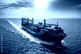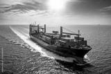 Aerial view of aloaded container cargo vessel traveling with high speed over blue sea