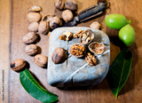 shelled walnuts with old peasant knife on gray stone with around dried and fresh walnuts food