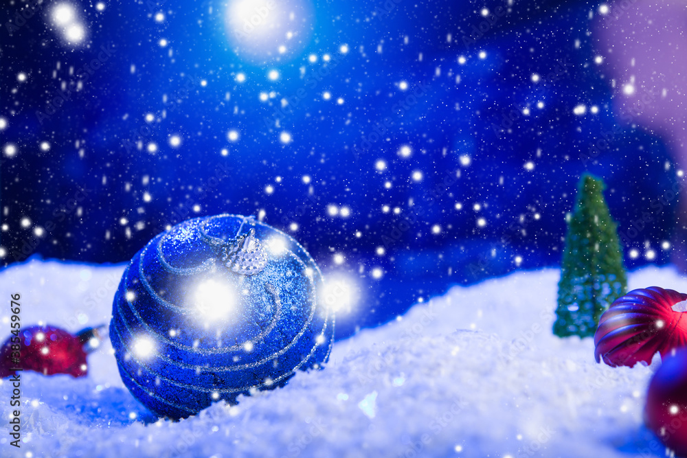 Christmas background with Christmas balls on snow over fir-tree, night sky and moon. Shallow depth of field. Christmas background. Fairy tale. Macro. Artificial magic dreamy world.