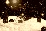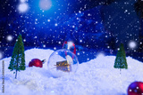 Christmas background with Christmas balls on snow over fir-tree, night sky and moon. Shallow depth of field. Christmas background. Fairy tale. Macro. Artificial magic dreamy world.