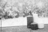 Beautiful Christmas red and white candles lie on the wooden table over snow covered forest background. Atmosphere of magic and fairy tales