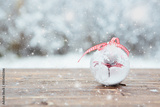 Christmas and New years holiday background. Beautiful Christmas bauble decorations lie on the wooden table over snow covered forest background. Atmosphere of magic and fairy tales