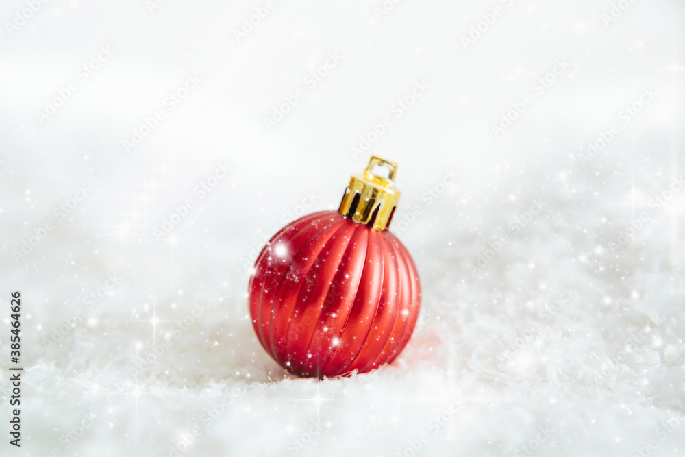 red christmas ball lying on snow Beautiful Christmas bauble decorations lie on the white fluffy snow. Atmosphere of magic and fairy tales