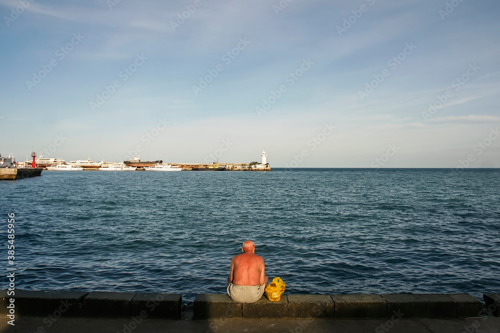 Elderly man looks at the blue sea, lighthouse, yachts at sunset.