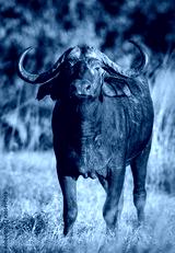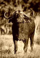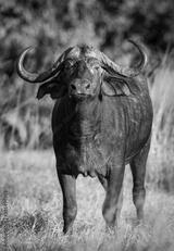 Vertical portrait of a male buffalo looking straight at the camera in Moremi Reserve in Botswana