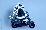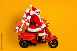 Profile side view of his he nice funny cheery amazed St Nicholas riding moped hurry up delivering pile stack giftboxes December winter isolated bright vivid shine vibrant yellow color background