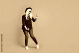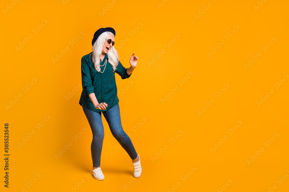 Full length photo of crazy granny lady music lover senior party cool look dance youth moves wear green shirt sun specs necklace retro cap shoes isolated yellow color background