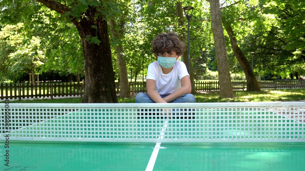 Europe, Italy , Milan - life style of boy six years old with mask during Covid-19 quarantine home lockdown outbreak