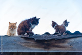 Cats sitting on roof of building or shed, kitten family on high fence. Countryside and village, domestic animal pet spending time outdoors. Playing wild kitty in summer, view against blue sky