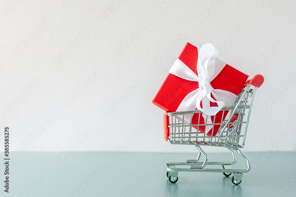 Shopping for holidays and special occasions. Miniature cart with gift box and ribbon. Christmas and new year presents, anniversary or valentines. Festivity and greetings, copy space and small trolley