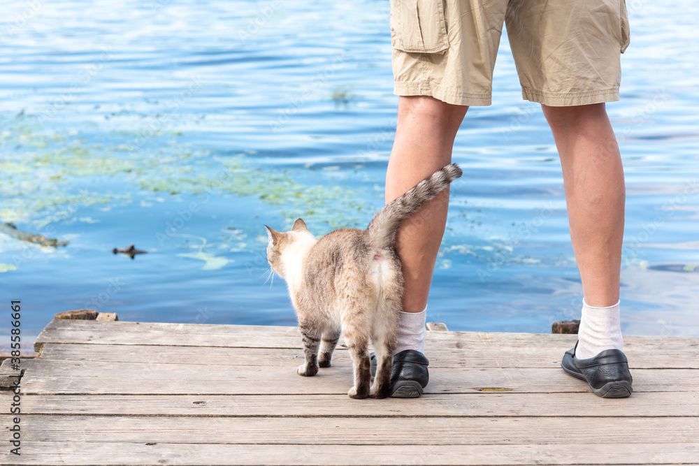 Kitty and pet owner on wooden deck or pier by river, lake or pond. Domestic animal with person, friendship of devoted kitty and human. Resting outside by water, nature scenery, tranquil landscape