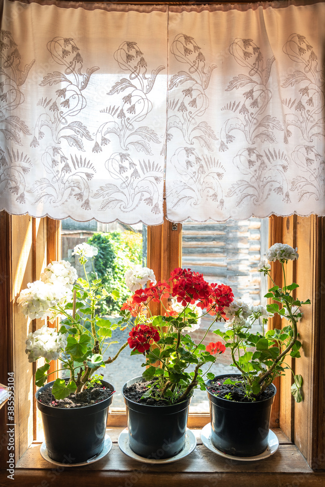 Window with curtains and blooming flowers on sill. Interior of house, inside design of home in rural area or countryside. Blossom of potted plants, vibrant decoration for dwelling. Rustic look