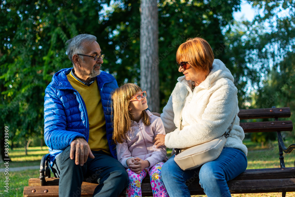 Senior grandparents with small granddaughter sitting outside in park at fall.