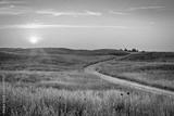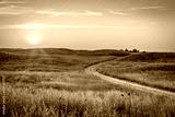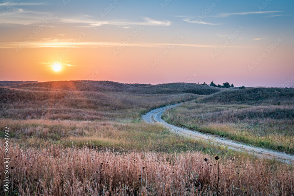 hazy sunrise over Nebraska Sandhills with a dirt sandy road at Nebraska National Forest, fall scenery affected by wildfire smoke from Colorado and Wyoming