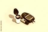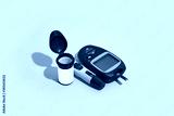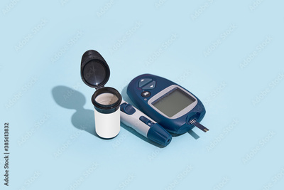 Glucose meter and pen on blue background with shadow, Metabolic syndrome concept