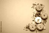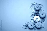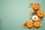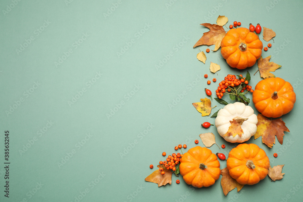 Different ripe pumpkins, autumn leaves and berries on green background, flat lay. Space for text