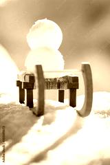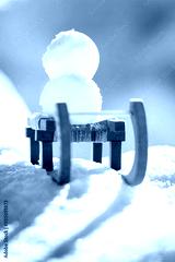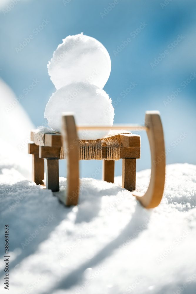 Snowballs on a wooden sledge standing in the snow, concept Winter and holidays