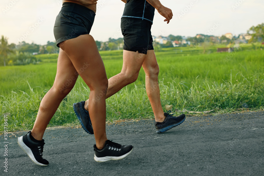 Couple Running On Road At Tropical Landscape In Morning. Man And Woman On Jogging Workout Near Green Rice Fields.