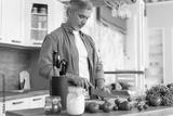 Grey-haired Mature handsome man preparing delicious and healthy food in the home kitchen