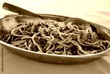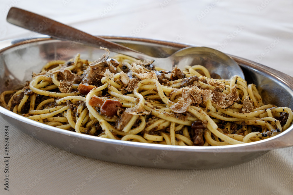 A dish of spaghetti alla chitarra with fresh truffle and mushrooms a typical Italian plate from Abruzzo region
