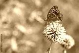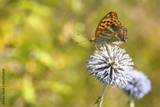 Bright orange and black spotted butterfly, the silver-washed fritillary, sitting on violet globe-thistle flower growing in a meadow on a summer day. Blurry yellow and green background.