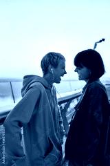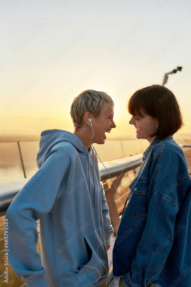 Young lesbian couple having fun while listening to music sharing one same earphones, Two women laughing, spending time together outdoors