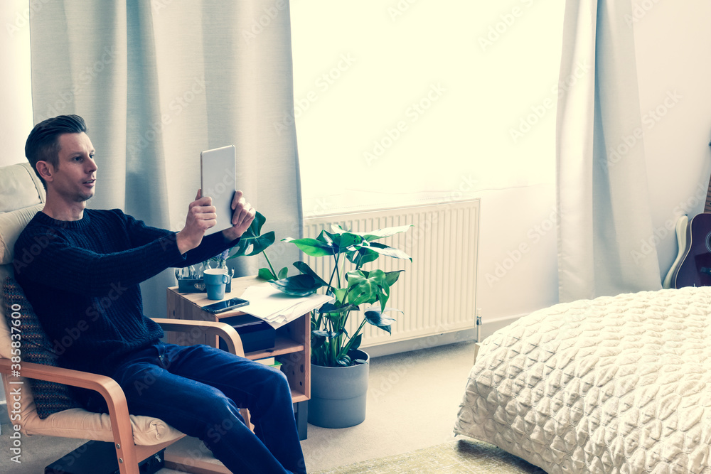 Man using a tablet device for a video call whilst working from home in a bedroom