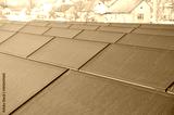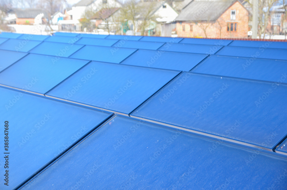 A complex of solar battery panels near the houses as a means of renewable energy source.