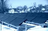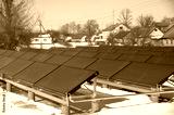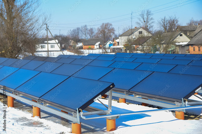 A complex of solar battery panels near the houses as a means of renewable energy source.