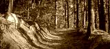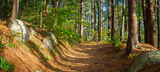 Panoramic walking trail in the pine tree forest with rocks and pine needles on the dirt road