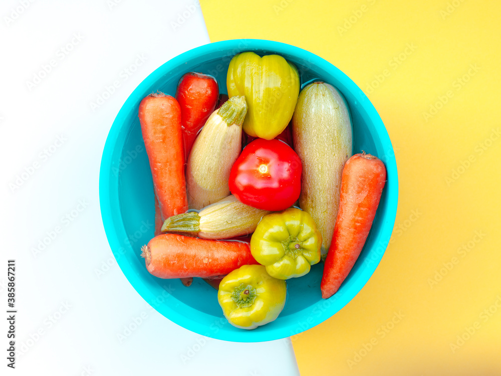 Bowl with vegetables on yellow white background