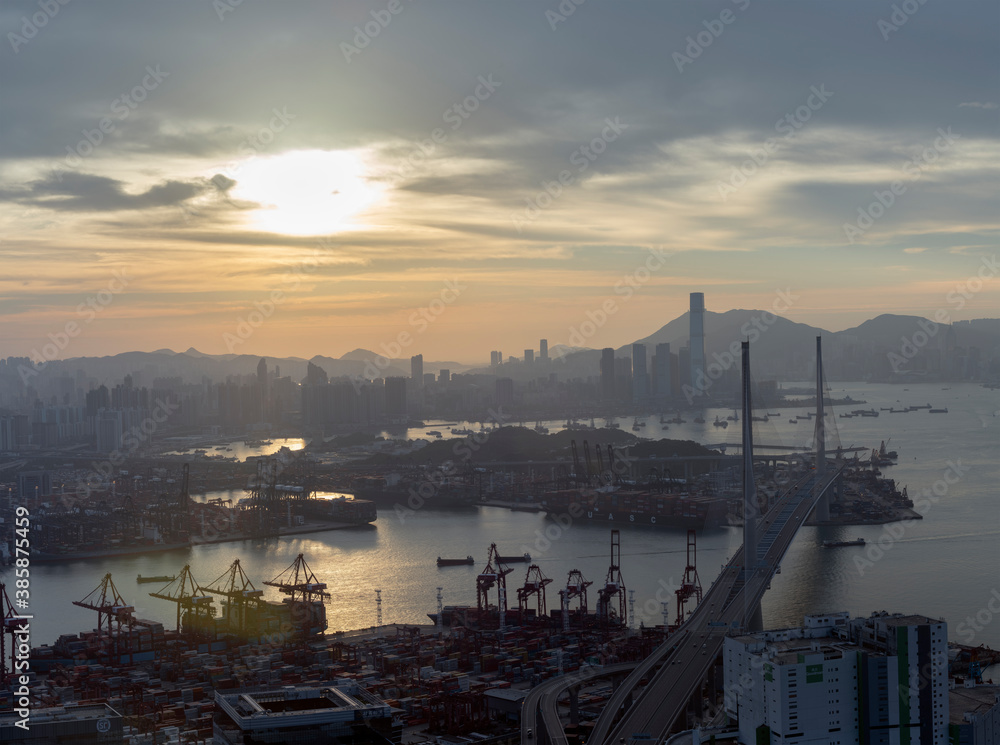 Stonecutters Bridge & Container port from Tsing Yi at Sunrise, Hong Kong