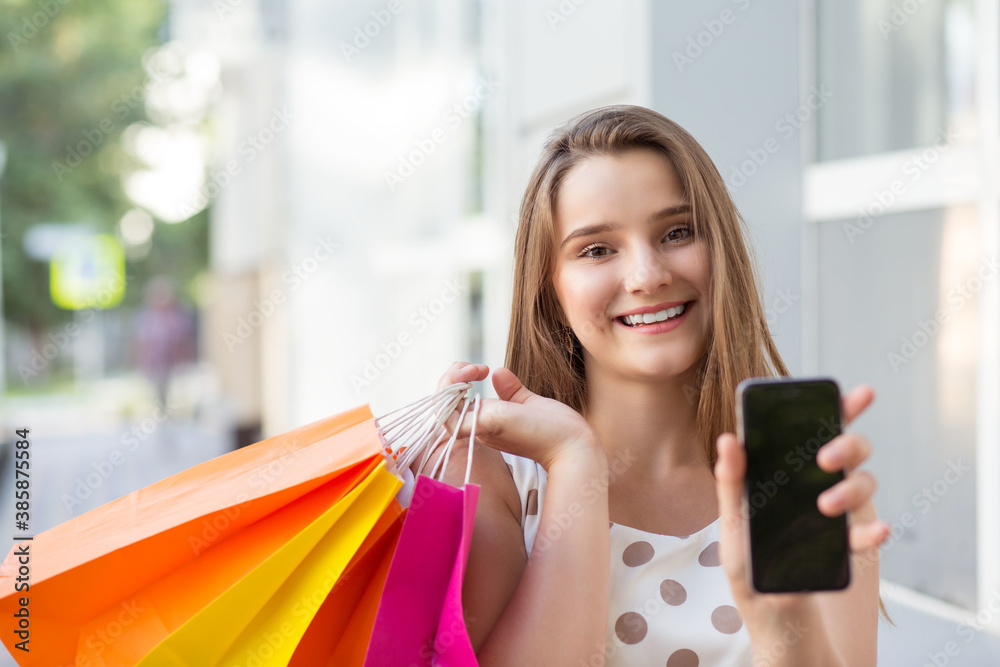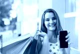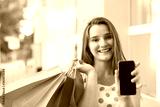 Smiling female with paper bags and smartphone