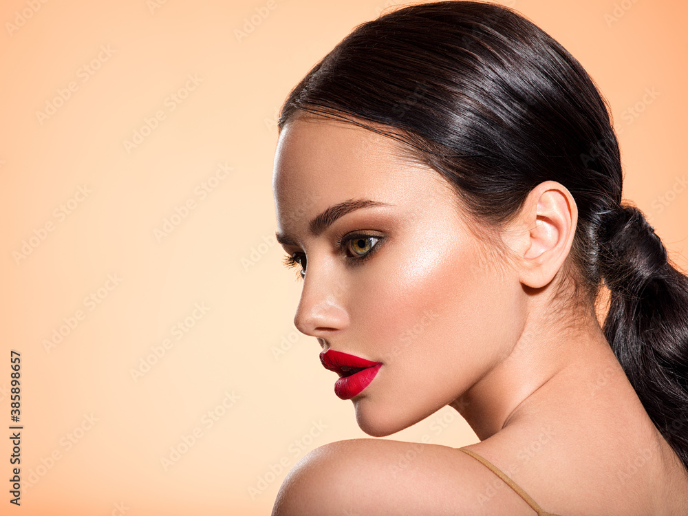 Beautiful white girl with a red lipstick on lips. Stunning brunette girl with long black hair. Closeup face of young beautiful woman with a healthy clean skin. Pretty woman with bright makeup