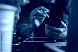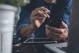 Multitasking business man using mobile phone working on laptop computer with digital tablet on office table at home