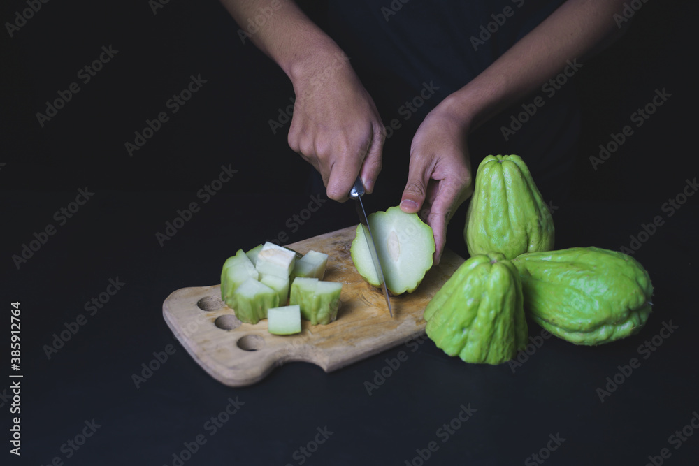 Chayote squash or Mirlition squash cutting by kitchen knife preparing for cooking, organic vegetable, edible plant fruit