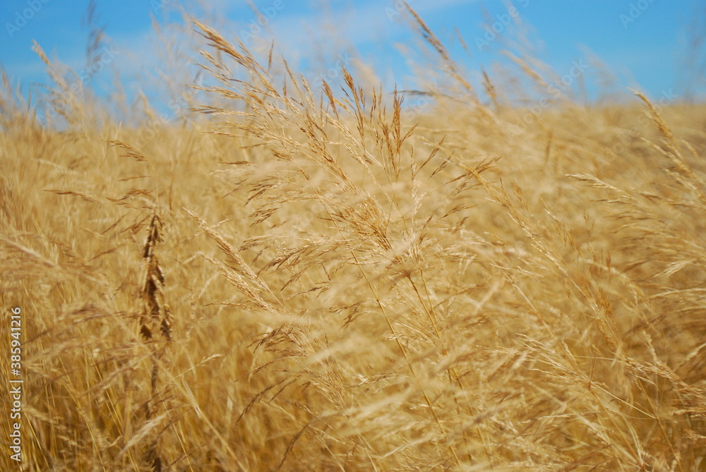 Złote kłosy zbóż oraz trawy w słoneczny, letni dzień na tle błękitnego nieba