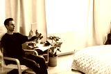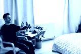 Man using a tablet device for a video call whilst working from home in a bedroom