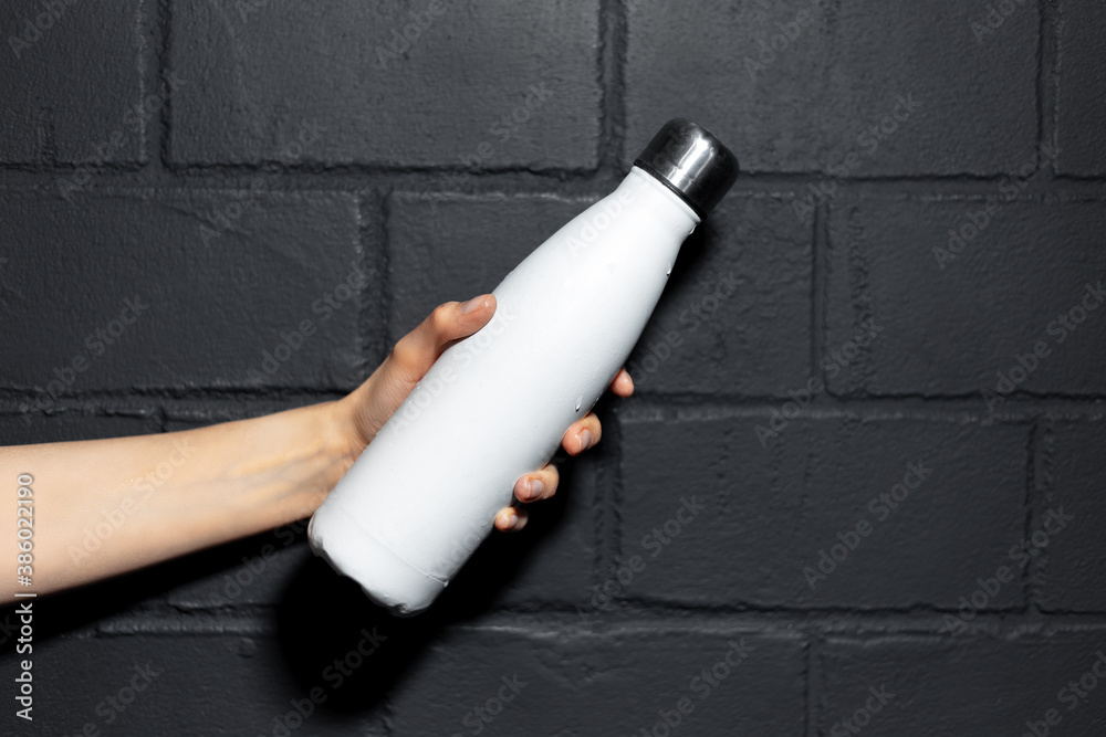Close-up of female hand, holding steel reusable thermo water bottle of white color, on background of black brick wall.