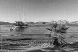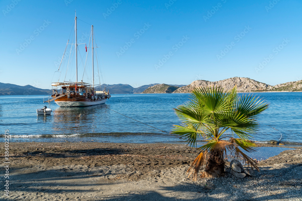 A traditional Turkish gulet boat anchoring at a small bay. Sandy beach and a single palm tree. Blue sky and sea.