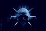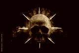 Photo collage of red human skull, bullets and smoke. Crime, war concept.