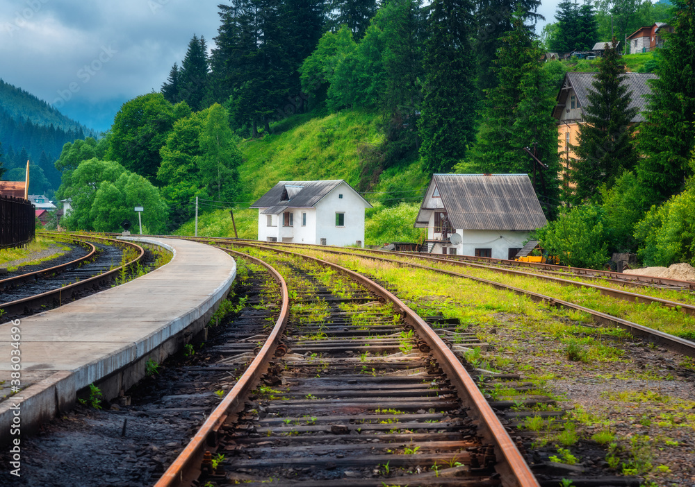 Railway station and small white house in mountain village at sunset. Rural railroad in overcast day in summer. Industrial landscape with railway platform, green trees, grass, buildings in cloudy day