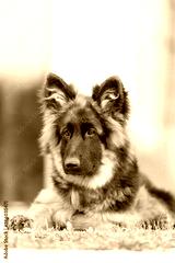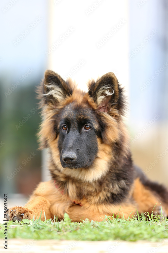 Portrait of a black and tan long-haired german shepherd puppy
