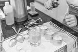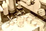 Creative occupation of candle making showing the pouring of liquid wax into jars